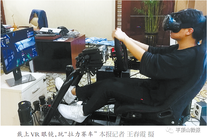 办公室内摆着一台公司刚自主研发的“拉力赛车”,按照赛车驾驶舱1:1设计,四个液压轴相当于四轮驱动,可以上下滑动,增加真实的动感,戴上VR眼镜就像在真实路况上驾驶赛车一样。