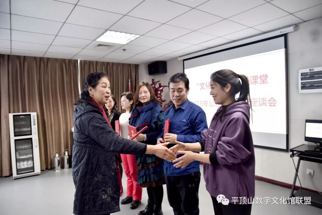 1月10日,我馆邀请广大公益培训教师和公益团队代表参加“文化客厅”公益课堂2018年度交流座谈会。座谈会上,群艺馆馆长对2018年开展的“文化客厅”公益活动进行梳理和总结,市文广新局相关领导出席了座谈会,为“文化客厅”公益课堂今后的发展方向做出了部署和指导,并为“最美文化志愿者”和“优秀文化志愿者”颁发了荣誉证书,并对所有无私奉献的文化志愿者们表示衷心的感谢。